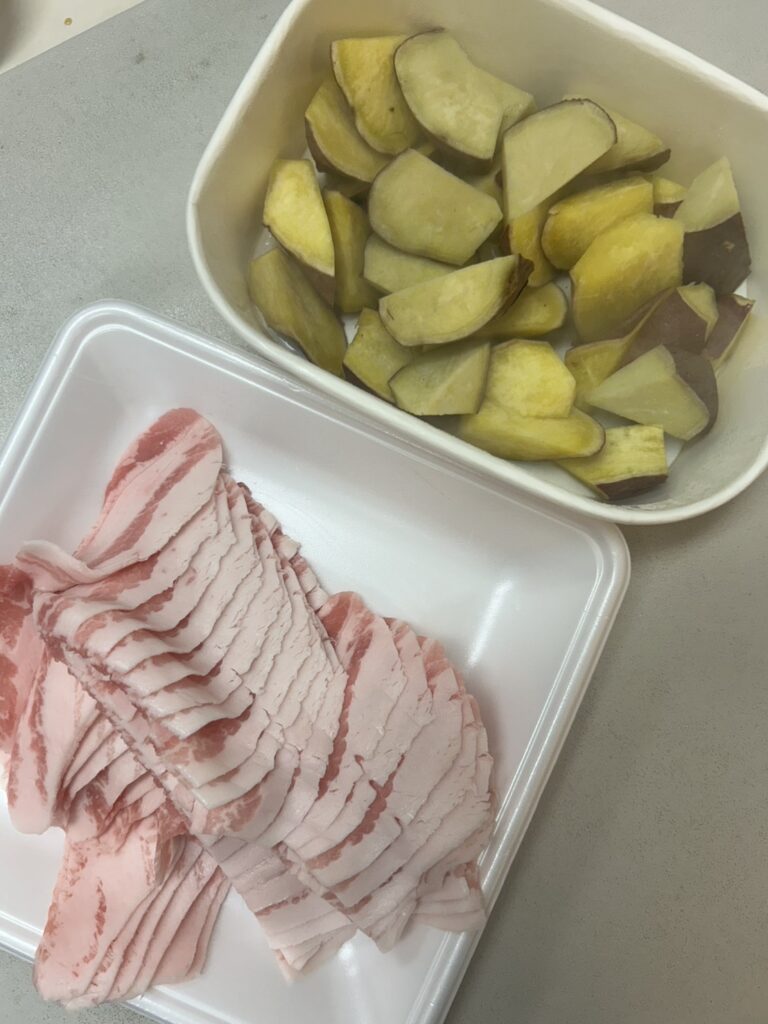 本日のメニューは「豚肉とさつまいもの甘辛炒め」です。