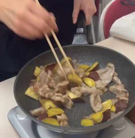 - 豚肉の色が変わってきたら、(1)で加熱したさつまいもを加えます。